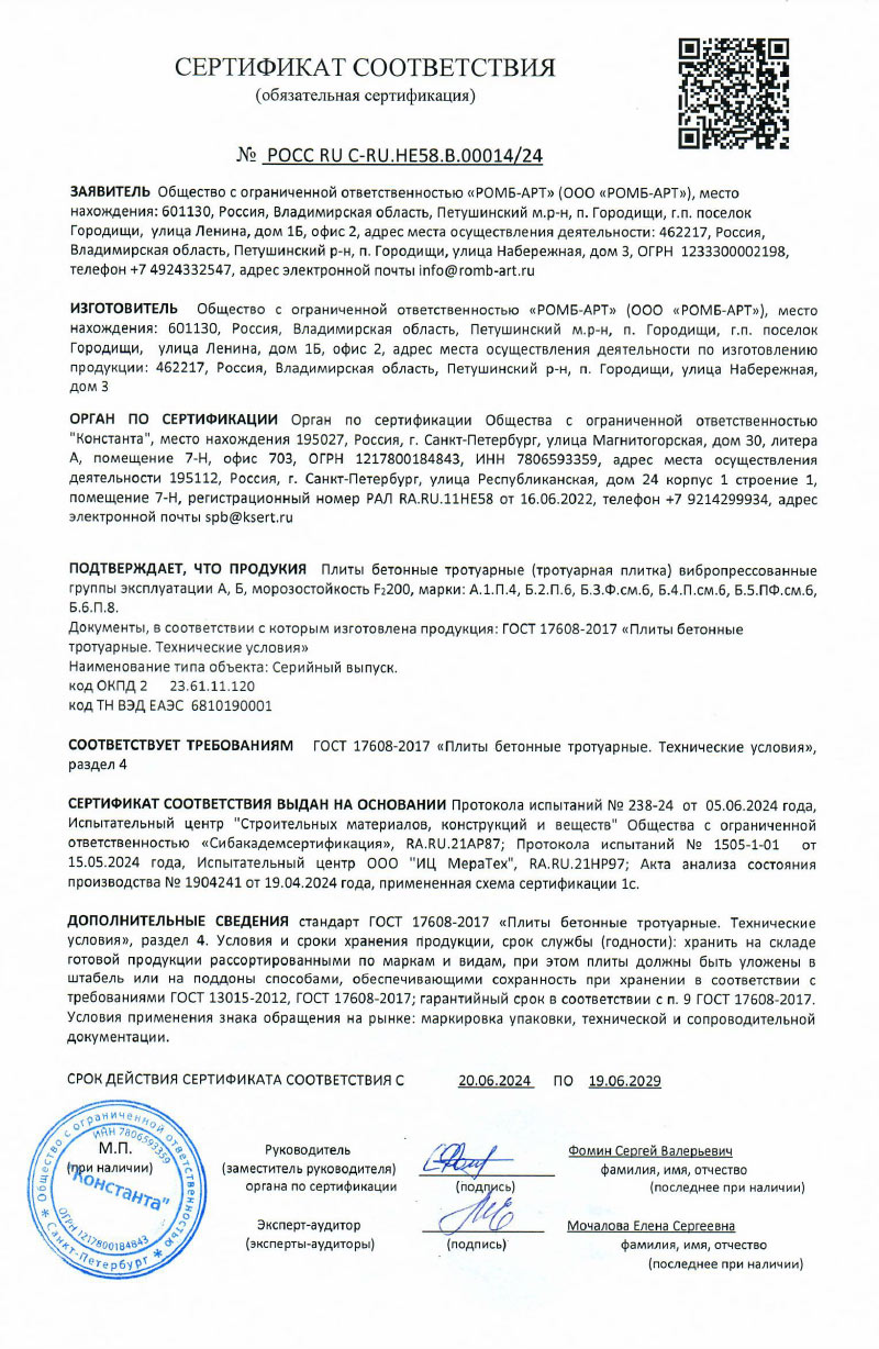 Гарантия соответствия нормативам. Вся продукция завода «Ромб-Арт» проходит обязательную сертификацию, подтверждающую соответствие техническим условиям и государственным стандартам РФ. Представленный документ является гарантией высокого качества бетона, точности форм и износостойкости декоративного слоя нашей тротуарной плитки.